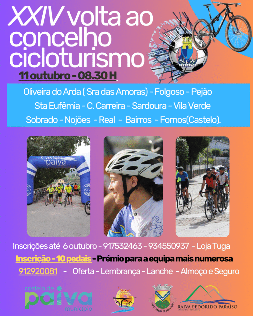 Até ao dia 6 de Outubro, ainda estão abertas as inscrições para XXIV Volta ao Concelho em Cicloturismo, uma jornada desportiva que se vai realizar na manhã de Sábado, 11 de Outubro, e que promete ser um êxito, como sempre, será integrada no programa dos XXXIX Jogos Desportivos de Castelo de Paiva, importante iniciativa que a autarquia paivense ainda está a levar efeito.